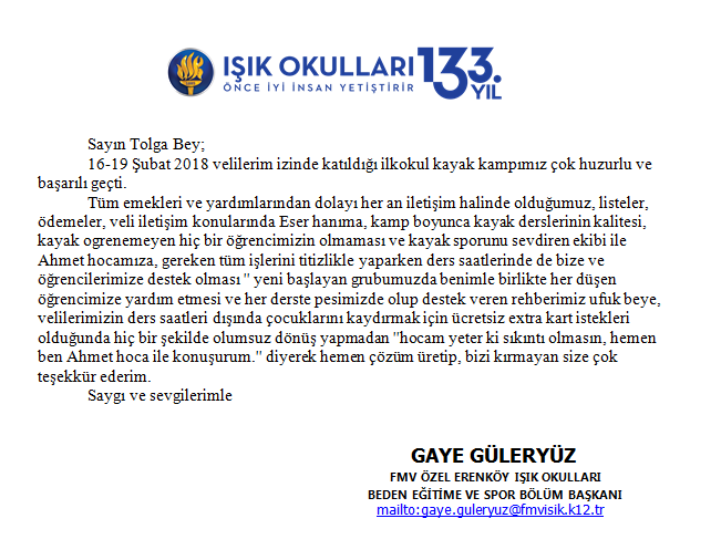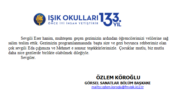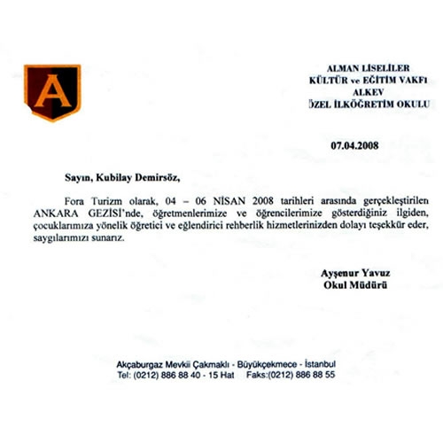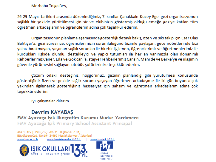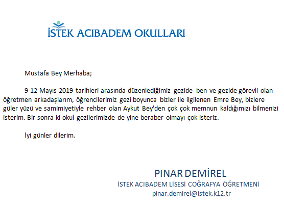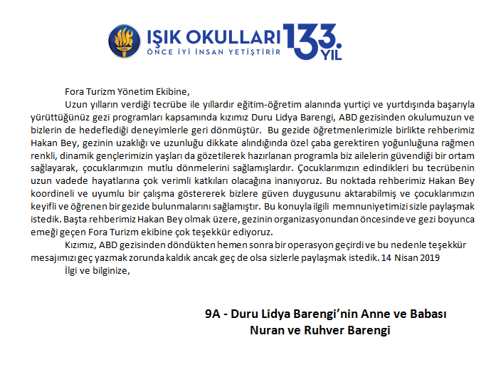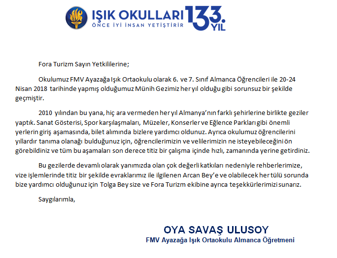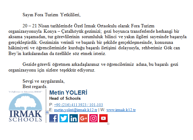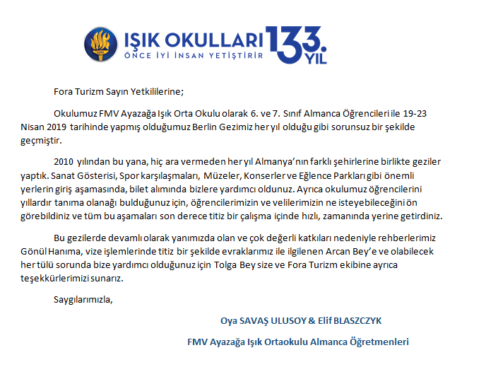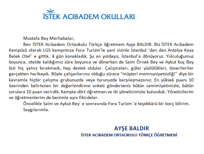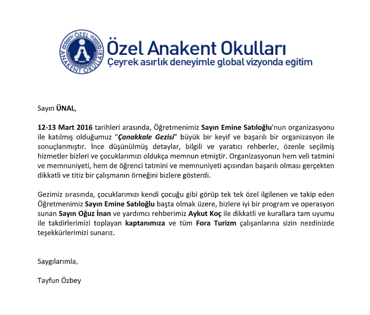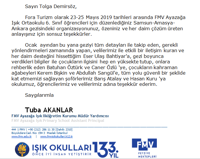 Fora Turizm'e İletilen Teşekkürler